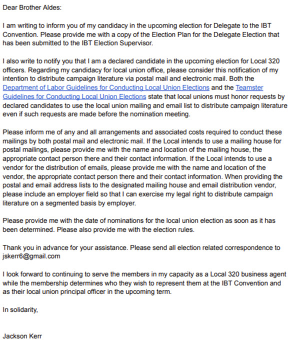 On Friday, September 19, 2025, Kerr notified Aldes of his candidacy in the upcoming election for delegate in the Election and candidacy for Secretary-Treasurer in the upcoming Local Election. He also requested a copy of Local 320’s LUEP, provided notice of his intent to distribute campaign literature via mail and email in connection with his candidacy in the Local Election,[3] and asked for additional information in connection with his distribution of campaign literature. A copy of this correspondence is below: