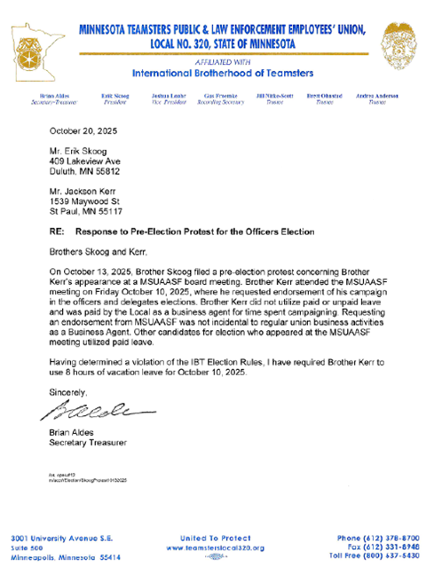 On October 20, 2025, Aldes sent a letter on Local 320 letterhead signed in his official capacity as Secretary-Treasurer to Skoog and Kerr (the “Vacation Time Letter”). In the Vacation Time Letter, Aldes stated that Skoog filed a pre-election protest against Kerr for seeking an endorsement from MSUAASF without taking a vacation day—the same allegations set forth in P-018. Aldes determined that this was not incidental to regular union business activities and found that Kerr violated the “IBT Election Rules.” He further required Kerr to take 8 hours of vacation leave for October 10, 2025. A copy of the Vacation Time Letter is below: