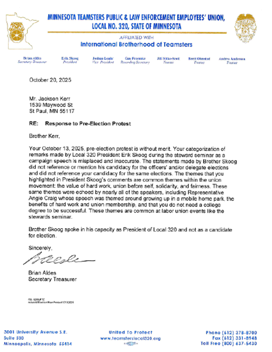 Aldes sent another letter dated October 20, 2025, to Kerr regarding Kerr’s pre-election protest filed October 13, 2025, alleging that Skoog’s remarks during his speech at the Seminar were impermissible campaign speech (“Campaign Speech Letter”). Aldes determined that Kerr’s protest was meritless because Skoog did not reference his candidacy for either election and the themes discussed were “common themes within the union movement: the value of hard work, union before self, solidarity and fairness.” A copy of the Campaign Speech Letter is below: