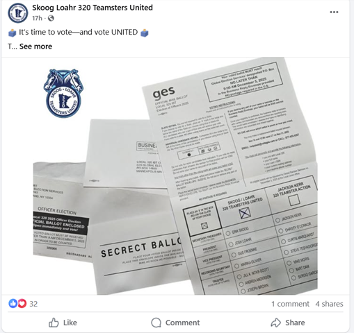 The 320 Teamsters United slate (“320 Teamsters United Slate”) headed by Skoog-Loahr, consists mostly of current Local 320 officers. Skoog is running for Secretary Treasurer, Loahr is running for President, Gus Froemke is running for Vice President, Marika Olivier is running for Recording Secretary, and Jill Nitke-Scott, Andrea Anderson, and Joe Brown are running as trustees on this slate. All of these individuals were also nominated as candidates on the 320 Teamsters United Slate for the IBT Delegate Election at the nomination meeting on November 1, 2025. Aldes is retiring as Secretary-Treasurer but has stated that he has been “grooming” Skoog to take over as Secretary-Treasurer of Local 320.