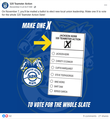 The 320 Teamster Action website homepage states, “you will be mailed a ballot to elect new Local 320 leaders” and “320 Teamster Action is a movement of members across Local 320 to win new leadership and a new direction in our union.” https://320teamsteraction.org/ (emphasis added). Additionally, it includes a giant image of the ballot for the Local Officer Election.